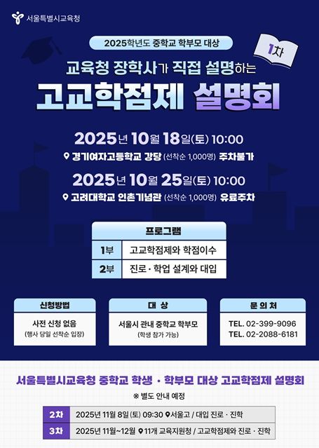 이번 10월 설명회 1부에서는 서울시교육청 고교학점제 업무 담당 장학사가 △고교학점제의 이해와 학점 이수 제도에 대해 설명하고, 2부에서는 △진로·학업 설계와 대입 준비 등에 대해 안내한다.