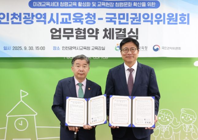 (아름다운교육신문) 인천광역시교육청은 9월 30일 국민권익위원회와 청렴한 미래인재 양성과 교육 현장의 청렴 문화 확산을 위한 업무협약을 체결했다.