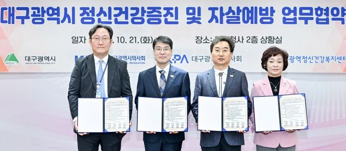 (아름다운교육신문) 대구광역시는 10월 21일 오전 11시 동인청사 2층 상황실에서 ‘대구광역시 정신건강 증진 및 자살예방 업무협약’을 체결했다. 이번 협약은 대구 시민의 정신건강 증진과 자살 예방을 위한 지역사회 거버넌스 구축을 목표로 한다.