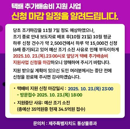 (아름다운교육신문) 제주특별자치도는 택배 추가배송비 지원 사업이 당초 11월 7일 종료 예정이었으나, 신청 급증으로 10월 23일 오후 11시(방문 접수 오후 6시)에 조기 종료된다고 밝혔다.