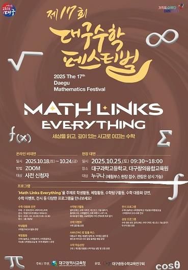 (아름다운교육신문) 대구시교육청이 주최하고 대구중등수학교육연구회가 운영하는 ‘제17회 대구수학페스티벌’이 10월 25일 9시 30분부터 대구과학고 및 대구창의융합교육원에서 'Math Links Everything(수학은 모든 것을 연결한다)'이라는 주제로 개최된다.