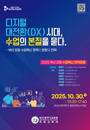 (아름다운교육신문) 부산광역시교육청은 오는 30일 오후 부산교육대학교 참빛극장에서 초등 교원과 교육전문직원 등 200여 명을 대상으로 ‘디지털 대전환(DX)* 시대, 수업의 본질을 묻다’를 슬로건으로 ‘2025 부산 초등 수업혁신 정책포럼’을 개최한다고 밝혔다.