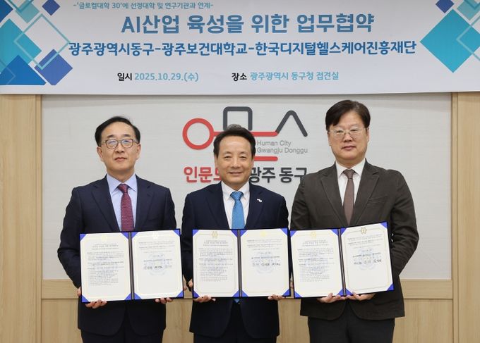 (아름다운교육신문) 광주 동구는 지난 29일 구청 접견실에서 광주보건대학교(총장 김경태), 한국디지털헬스케어진흥재단(원장 박기원)과 인공지능(AI) 헬스케어 산업 육성, 인구 감소 해결, 원도심 활성화를 위한 업무협약을 체결했다고 밝혔다.