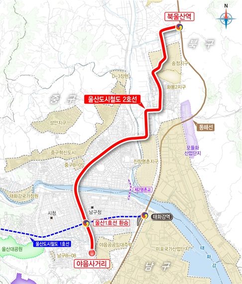 도시철도 2호선은 사업비 4,400억 원을 투입해 오는 2032년 개통을 목표로 추진하고 있는 사업이다. 운행 구간은 북울산역을 기점으로 북구 진장유통단지를 거쳐 중·남구 번영로를 통해 남구 야음사거리까지 13.55km이며, 정거장 14곳이 설치된다.