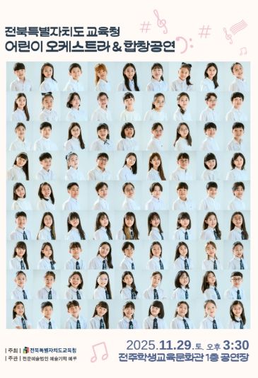(아름다운교육신문) 전북특별자치도교육청은 오는 29일 전주학생교육문화회관 1층 공연장에서 ‘2025 전북특별자치도교육청 어린이 오케스트라 & 합창공연’을 개최한다.