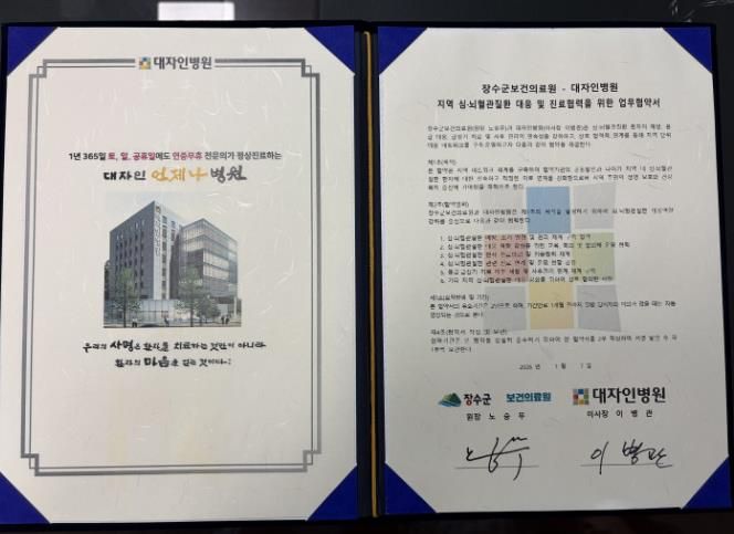 (아름다운교육신문) 장수군은 대자인병원과 심뇌혈관질환 발생 시 신속하고 효과적인 대응을 위해 상호 진료협력 체계를 구축하는 ‘심뇌혈관질환 대응 진료협력 협약(MOU)’을 체결했다고 9일 밝혔다.