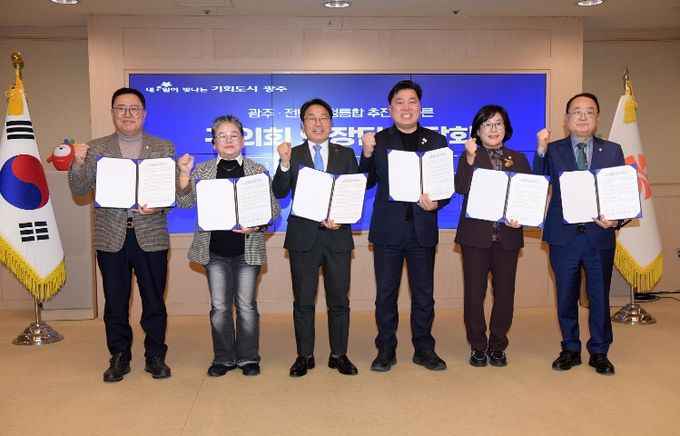 광주광역시는 12일 시청 비즈니스룸에서 ‘광주·전남 행정통합’ 관련 자치구의회 의장단 간담회를 열어 ‘(가칭)광주전남특별시’의 성공적인 안착을 위해 상호 긴밀히 협력키로 하는 대통합 공동 선언문을 채택, 발표했다.