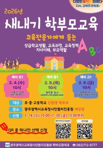 (아름다운교육신문) 광주시교육청시민협치진흥원은 오는 2월 4~6일 본원 대강당에서 초·중·고등학교 신입생 학부모를 대상으로 ‘2026년 새내기 학부모교육’을 운영한다.