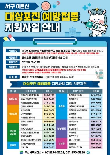 (아름다운교육신문) 부산 서구는 올해 65세 이상 어르신들을 대상으로 대상포진을 예방하고 노년기 삶의 질 향상을 도모하고자 대상포진 예방접종 지원사업을 오는 2월부터 서구 관내에 첫 도입한다.