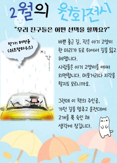 (아름다운교육신문) 대전학생교육문화원 부설 산성어린이도서관은 독서 흥미 유발 및 도서관과의 친밀감 형성을 위해 출판사와 연계한 2026년 원화 전시를 2월부터 연간 5회 운영한다고 밝혔다. 원화 전시는 인쇄된 책에서는 느끼기 어려운 작가의 생생한 붓 터치와 색감을 원본 그림을 통해 직접 감상할 수 있는 행사다.