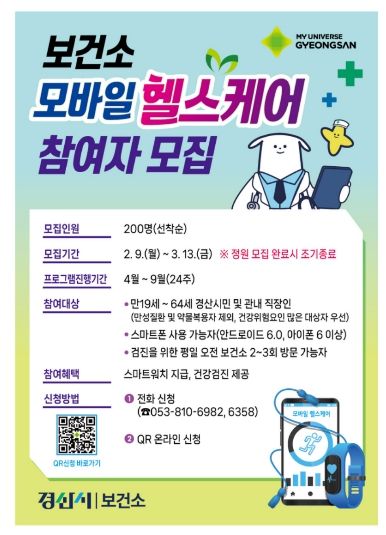 (아름다운교육신문) 경산시는 ICT 기술을 활용해 시민의 생활 습관을 개선하는‘2026년 모바일 헬스케어 사업’ 참여자 200명을 오는 9일부터 모집한다고 밝혔다.