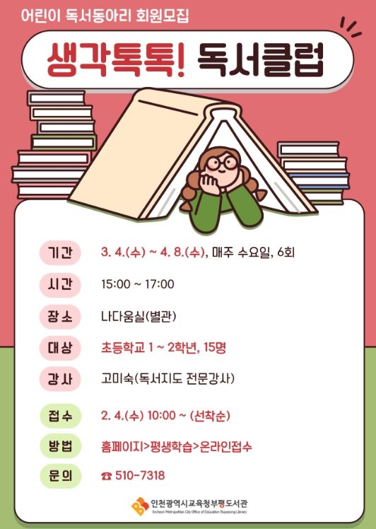 (아름다운교육신문) 인천광역시교육청부평도서관은 3월 4일부터 4월 8일까지 2026년 상반기 어린이 독서동아리 ‘생각 톡톡! 독서클럽’을 운영한다.