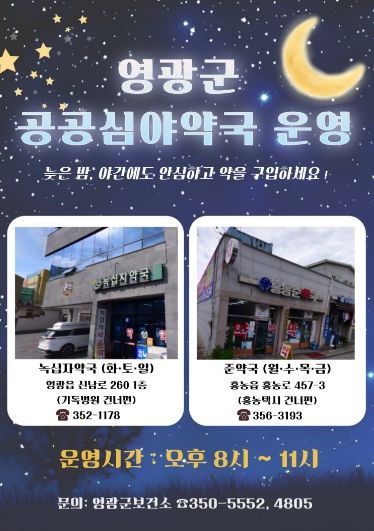 (아름다운교육신문) 영광군은 오는 2월 9일부터 공공심야약국 2개소를 지정하여 매일 오후 8시부터 11시까지 운영한다고 밝혔다.
