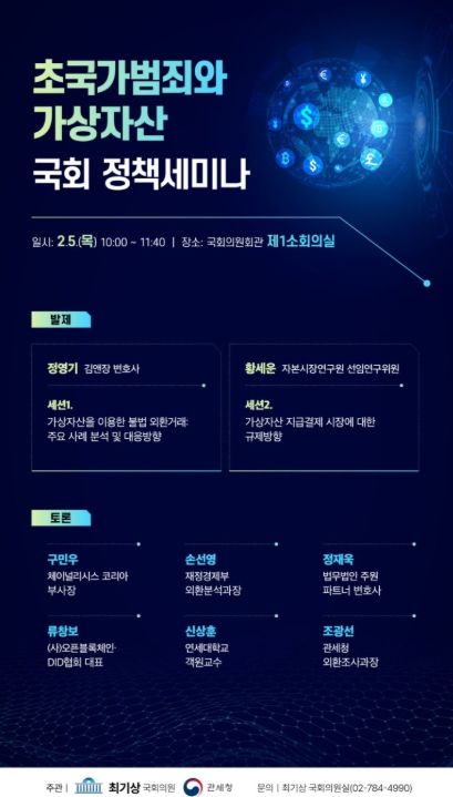 (아름다운교육신문) 관세청은 최기상 국회의원(더불어민주당·서울 금천구)과 공동으로 2월 5일 국회 의원회관에서 '초국가범죄와 가상자산: 국경을 넘어선 불법 자금 흐름 대응' 국회 정책 세미나를 개최했다.