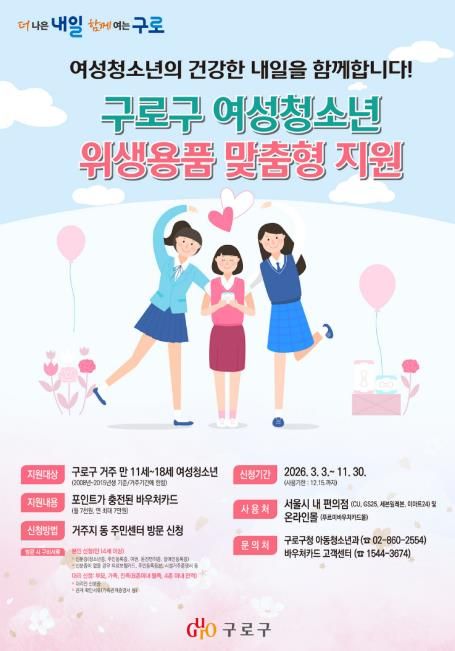 구로구 관계자는 “바우처 방식 도입으로 여성청소년이 필요에 맞는 제품을 보다 편리하게 구매할 수 있을 것으로 기대한다”며 “앞으로도 청소년이 신체적·심리적으로 건강하게 성장할 수 있도록 촘촘한 복지 행정을 펼쳐 나가겠다”고 말했다.