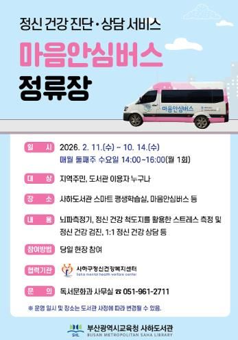 (아름다운교육신문) 부산광역시립사하도서관은 오는 2월부터 10월까지 매월 둘째 주 수요일마다 도서관 스마트 평생학습실과 마을안심버스에서 지역주민을 대상으로 ‘마을안심버스 정류장’을 운영한다.