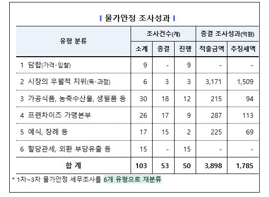 이에 국세청은 ’25.9월부터 ’26.1월까지 3차에 걸쳐, 과도한 가격 인상으로 폭리를 취하며 탈세를 일삼은 담합, 독・과점, 가공식품・생필품 제조, 농축수산물 유통 등 103개 업체에 대해 조사를 실시했으며, ’25.9.25. 착수한 1차 세무조사 결과, 53개를 종결하여 3,898억 원을 적출하고, 1,785억 원을 추징했다.