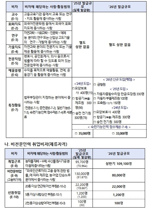 그 밖에 요양보호사, 송전전기원 등 이미 시범운영 중인 직종과 계절근로·비전문취업 비자 등은 외국인력 수요와 체류 실태를 종합적으로 고려하여 필요한 범위 내에서 연간 발급규모를 관리할 계획이다