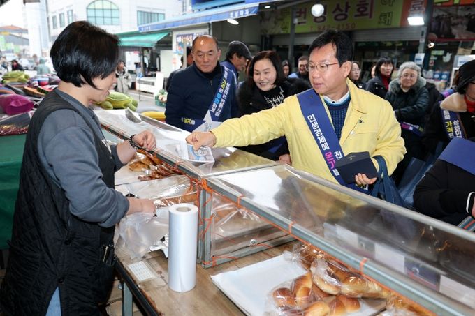 (아름다운교육신문) 박병규 광산구청장이 광산구 공직자들과 11일 송정매일시장에서 설 명절맞이 전통시장 장보기 행사와 함께 물가안정 캠페인을 진행했다.