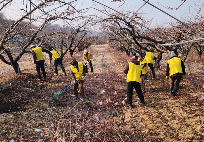 올해 사업은 지난 7일 새마을꽃마실봉사단 12명이 심천면 금정리에서 복숭아 나무 가지 줍기 및 전지 작업을 지원하며 시작됐다.