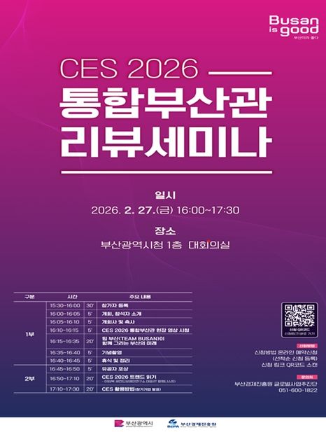 이날 세미나는 ▲CES 2026 통합부산관 현장 영상 상영 ▲'팀 부산이 함께 그리는 부산의 미래' 간담회 ▲'CES 2026 트렌드 읽기' 전문가 강연 ▲통합부산관 참가기업 성과 발표순으로 진행된다.