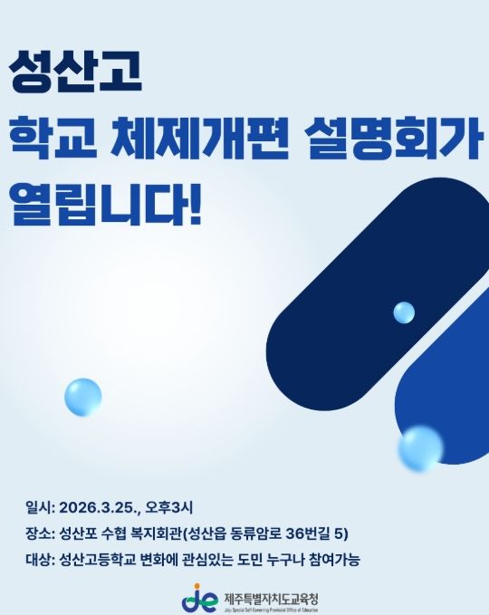 한편 이번 설명회는 성산 지역 주민을 비롯해 성산고 및 인근 중학교 학생·보호자, 교직원, 동문 등 학교 변화에 관심 있는 도민이면 누구나 참여할 수 있으며 설명회 자료는 행사 당일 현장에서 배부할 예정이다.