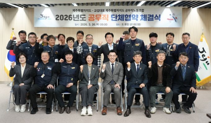 (아름다운교육신문) 제주특별자치도와 교섭대표 노동조합인 제주도 공무직노동조합이 26일 도청 삼다홀에서 ‘2026년도 공무직 단체협약’을 체결했다.