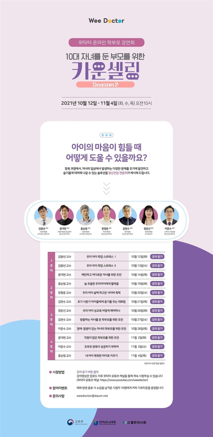 전라남도교육청이 교육부, (사)열린의사회와 함께 10월 12일부터 11월 4일까지 4주간 ‘10대 자녀를 둔 부모를 위한 카운슬링’이라는 주제의 학부모 온라인 강연회를 운영한다.