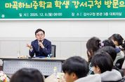 (아름다운교육신문) 진교훈 서울 강서구청장이 8일 구청 대회의실에서 마곡하늬중학교 3학년 학생들과 직접 대화하며 소통하는 시간을 가졌다. 구는 행정이 어떻게 이뤄지고, 공무원이 어떤 역할을 하는지 학생들이 현장에서 직접 체험하며 이해할 수 있도록 이날 자리를 마련했다. 3학년 1반과 4반 학생 40여 명이 구청을 찾아 진 구청장과 만났다. 진 구청장은 “구청에 직접 와보니깐 어때요?”라고 질문을 하며 대화를 이끌어갔다. 학생들의 장난스러운 질문에도 유쾌하게 답변했고 대화 내내 웃음이 끊이지 않았다. 길거리 흡연 등 생활불편부터 강서구의 주요 정책과 예산 규모, 10년 후 강서구에 필요한 정책에 이르기까지 폭넓게 대화했다. 진 구청장은 “마곡지구 발전과 맞물려 유동인구가 많아짐에 따라 간접흡연 피해 민원도 늘고 있다”며 “흡연 단속과 계도를 병행해 피해를 줄여나가겠다”고 말했다. 마곡 통합신청사와 신경제축 조성 등 굵직한 사업에 대해서는 학생들의 눈높이에 맞춰 알기 쉽게 설명했다. 10년 후 정책에 대해선 “변화의 속도가 매우 빠르기 때문에 기술의 발달을 미리