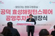 (아름다운교육신문) 박강수 마포구청장은 12월 3일 오후 5시, 공덕역 10번 출구 앞 광장에서 열린 ‘공덕 효성해링턴스퀘어 공영주차장 개장식’에 참석해 시설 개장을 축하했다. 이번에 문을 연 공덕 효성해링턴 스퀘어 공영주차장(도화동 25-13)은 총 21면 규모로 조성된 거주자우선주차장으로, 구는 공공기여를 통해 확보한 이 공간을 주민들에게 개방해 운영하기로 했다. 아파트와 상가, 오피스가 밀집한 도화동·공덕동 일대는 주차 수요에 비해 공간이 부족해 주민과 방문객 모두가 지속적인 불편을 겪어 왔다. 이번 공영주차장 운영을 통해 지역에서 꾸준히 제기돼 온 주차 불편이 상당 부분 해소될 것으로 기대되며, 생활권 내 주차 편의도 한층 개선될 전망이다. 행사는 식전 공연을 시작으로 개회 및 내빈소개, 경과보고에 이어 박강수 마포구청장의 기념사가 진행됐으며, 이어 테이프 커팅과 기념촬영 후 시설 라운딩이 이어졌다. 추운 날씨 속에서도 박강수 마포구청장을 비롯해 백남환 구의회 의장, 지역 주민 등 약 100여 명이 참석해 주차 공간 확충의 성과를 함께 축하했다. 박강수 마포구청장