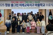(아름다운교육신문) 경상북도청송교육지원청은 12월 20일 청송교육지원청 대회의실에서 3개 마을학교 학생, 마을 교사, 학부모 등 약 100명이 참석한 가운데 2025년 청송 솔그린 미래교육지구 마을학교 수료식을 개최했다. 청송 솔그린 미래교육지구는 지역사회와 학교가 함께 교육력을 높여 평생교육까지 확장하여 배움이 있는 지속가능한 교육생태계를 조성하고자 경상북도청송교육지원청, 청송군청, 학교, 마을이 협력하고 연대하는 공동체로 2025년에는‘작은 학교 도담’,‘참보배 학교’,‘마실애 학교’3개의 마을학교가 청송 솔그린 미래교육지구 사업에 참여했다. 이날 수료식은 마을학교의 성과를 공유하고 지역사회의 학교 교육 참여를 확대하고, 마을과 함께 협력하는 돌봄을 활성화하기 위하여 마련됐다. 특히 올해는 미래교육지구 운영 3년 차를 맞아 3개 마을학교가 일 년 동안 활동한 모습을 영상으로 제작하여 감상하고 또한 학생들이 준비한 활동 소감을 마을학교별 대표 학생이 발표했다. 특히 진보초등학교 5학년 장○서 학생은 ‘1년간 주말과 방학 중에 열심히 지도하고 돌봐주신 마을학교 선생님들에게 감사하다.’고 말하여 참석