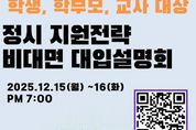 (아름다운교육신문) 경북교육청은 15일과 16일 양일간, 2026학년도 정시모집 지원을 대비하기 위해 ‘2026학년도 정시 지원전략 비대면 대입 설명회’를 운영한다고 밝혔다. 이번 설명회는 2026학년도 정시모집을 준비하는 학생과 학부모․교사에게 대학수학능력시험 분석 자료와 수도권·지역거점대학 등의 정시모집 정보를 제공해 지원전략 수립을 돕기 위해 마련됐다. 특히, 진학지도가 필요한 교사뿐 아니라, 실제 지원을 해야 하는 학생과 학부모님들에게도 기회를 제공하여, 불수능의 영향으로 혼란을 겪고 있을 경북 지역 학생과 학부모 모두에게 유익한 정보를 제공할 수 있을 것으로 기대된다. 양일간 진행되는 설명회는, 15일 19시에는 ‘2026학년도 대학수학능력시험 실시 결과와 수도권 15개 대학 정시모집 지원전략’을, 16일 19시에는 ‘수도권 대학, 지역거점국립대 및 지역 대학 정시 지원전략’을 주제로 운영되며, 참가자는 관심 분야에 맞는 설명회를 사전 선택해서 참여할 수 있다. 설명회는 ZOOM을 활용한 온라인 방식으로 진행되며, 참가 신청은 경북진학지원센터 누리집을 통해 가능하다. 김기활 중