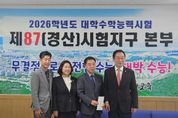(아름다운교육신문) 경산교육지원청은 2025년 11월 13일 대학수학능력시험 시행을 앞두고 12일 경산시험지구 업무 추진을 격려하기 위하여 임종식 경상북도교육감이 방문했다고 밝혔다. 경산(87)시험지구에서는 2026학년도 대학수학능력시험에 총 2,591명이 응시하며, 경산교육지원청 본부 관계자들은 경산·청도지역 8개 시험장 98개 시험실에서 차질 없는 시험 진행을 위해 총력을 기울이고 있다. 임종식 경상북도교육감은 업무를 수행하는 담당자들의 노고에 감사를 표했으며 ‘최적의 시험장 환경을 조성하여 모든 학생이 공정하고 안정적으로 시험을 치를 수 있도록 만전을 기하여 지원해주기를 바란다’라고 했다. 이에 정수권 교육장은 ‘시험본부와 모든 시험장에 근무하는 관계자와 긴밀하게 협력하여 모든 수험생이 안전하고 편안하게 수능에 응시할 수 있도록 최선을 다하겠다’라고 했다.