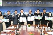 (아름다운교육신문) 거창군과 한국농어촌공사 거창·함양지사는 지난 11월 6일 구인모 거창군수, 정명석 한국농어촌공사 거창·함양지사장, 청년·여성농업인 대표들이 참석한 가운데 ‘거창군 스마트농업육성지구 조성사업’ 추진을 위한 위·수탁 협약식을 개최했다. 올해 10월 행정안전부 중앙투자심사 통과로 총사업비 200억 원(국비50%, 도비15%, 군비35%) 규모로 추진되는 ‘거창군 스마트농업 육성지구 조성사업’은 거창읍 대평리 일원 총 12ha 부지에 청년농, 승계농을 위한 임대형 스마트팜 단지를 구축하고, 생산-유통-교육-연구 기능을 연계한 복합형 스마트농업 기반을 조성하는 사업이다. 이번 위·수탁 협약은 ‘거창군 스마트농업 육성지구 조성사업’의 효율적인 사업 진행을 위해 체결하게 됐으며, 이번 협약으로 거창군은 사업의 총괄 관리와 행정 지원을 담당하고, 농어촌공사 거창·함양지사는 실시설계, 공사 시행, 준공, 시설 인계인수 등의 역할을 일괄 수행하게 된다. 사업이 완료되면 청년농업인들이 입주하여 첨단 스마트농업 기술을 활용한 고부가가치 농업을 실현하게 되며, 지역 농업의 경쟁력 강화와 미래농업 기반조성에 큰 역