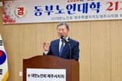 (아름다운교육신문) 김완근 제주시장은 2월 11일 조천주민교류센터 회의실에서 열린 제21기 동부노인대학 졸업식에 참석해 축하 인사를 전했다. 이번 졸업식은 졸업생 32명과 내빈 등이 참석한 가운데 학사보고, 졸업증서 수여, 표창 수여, 축사 등의 순서로 진행됐다. 제주시 동부노인대학은 2년 과정의 교육프로그램으로, 어르신들의 삶의 질을 높이고 건강한 노후 생활을 지원하기 위해 운영되고 있다. 프로그램은 매주 화요일과 수요일 2시간씩 진행되며, 노인 교양, 건강관리, 정치·사회·시사 상식, 문화 체험 활동 등 다양한 내용으로 구성돼 있다. 김완근 제주시장은 “노인대학을 졸업하신 여러분께 진심으로 축하의 말씀을 드리고, 나이를 뛰어넘는 여러분의 열정과 도전은 우리 모두에게 큰 울림을 주고 있다”며, “병오년 새해 배움의 기쁨이 여러분의 삶의 버팀목이자 활력이 되어 언제나 건강하고 행복한 나날을 이어가시길 바란다”고 말했다.