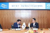 (아름다운교육신문) 화순군은 지난 10월 10일 경기도 용인특례시와 자매결연을 체결한 데 이어 10월 29일 대구광역시 중구와 상호 협력과 공동 발전을 위한 우호교류 협약식을 개최했다고 밝혔다. 이번 협약은 두 지역이 보유한 풍부한 인프라를 기반으로 활발한 교류를 추진해 생활 인구 확대와 지역경제 활성화, 지방 소멸 위기 공동 대응을 도모하기 위해 마련됐다. 이날 협약식에는 구복규 화순군수와 류규하 대구 중구청장, 오형열 화순군의회 의장, 김동현 대구중구의회 의장을 비롯한 주민자치회, 새마을회 대표 등 민관이 함께 참석하여 그 의미를 더했다. “함께 새롭게! 더 행복하게!”를 주제로 진행된 협약식에서 두 지자체는 문화·관광·체육·경제·교육·행정 등 다양한 분야에서 상호 교류와 협력을 추진하기로 했다. 특히 대표 축제 교차 홍보 및 상호 방문 등 실질적이고 지속 가능한 교류사업을 발굴해 나아갈 예정이다. 우호교류 협약을 기념해 화순군은 지역 대표 특산품인 샤인머스켓과 불미나리즙을, 대구 중구는 국가 무형유산인 단청장 보유자가 제작한 단청 공예품과 약령시에서 생산한 약령황제단을 선물했다.