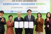 (아름다운교육신문) 경상남도교육청은 12일 인천광역시교육청에서 교육·연구 분야의 교류를 활성화하고 두 기관의 상생 발전을 돕기 위한 업무 협약을 체결했다. 두 교육청은 이번 협약을 통해 긴밀한 소통 체계를 구축하고, 각 기관의 우수한 교육 프로그램을 연계해 상호 발전적인 교육 정책을 펼쳐 나갈 계획이다. 협약식은 양측 관계자들이 참석한 가운데 협약서 낭독과 서명에 이어, 구체적인 교류 협력 방안을 논의하는 대담 순으로 진행됐다. 특히 두 기관은 독서교육 정책을 핵심 협력 과제로 정했다. 경남교육청의 ‘언제나 책 읽는 학교’와 인천교육청의 ‘읽걷쓰(읽기·걷기·쓰기)’ 프로그램을 서로 공유하고, 이를 더욱 발전시키기 위해 힘을 모으기로 했다. 주요 협약 내용은 ▲기관별 운영 프로그램 연계를 통한 발전 노력 ▲핵심 역량 함양을 위한 독서교육 추진 협력 ▲지역 문제 해결 및 사회공헌 프로그램 개발·운영 ▲기타 교육 발전에 필요한 사항에 대한 상호 지원 등이다. 박종훈 교육감은 “이번 협약은 시·도교육청의 경계를 넘어 미래 교육을 위한 교육 생태계를 구축하기 위한 토대를 마련했다는 점에서 의미가 크다”라며,