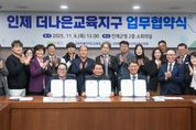 (아름다운교육신문) 강원특별자치도교육청은 11월 6일 인제군청 2층 소회의실에서 인제군청, 인제교육지원청과 ‘인제 더나은교육지구 연장지정 업무협약’을 체결했다. 이번 협약은 2018년 제1기(4년), 2022년 제2기(4년)에 이어, 2026년부터 4년간 제3기 더나은교육지구 사업을 본격 추진하기 위해 마련됐다. 세 기관은 ‘인제에서 더나은 인재를 함께 키우다’라는 비전 아래, 지역 여건을 반영한 교육 협력 사업을 추진하기 위해 매년 4억 원(교육청 2억 원, 군 2억 원)을 지원한다. 인제 더나은교육지구는 지역의 특수성을 반영해, 지역 기반 돌봄·배움터를 통한 전인적 성장 지원 및 지역 교육생태계 조성을 목표로 한다. 지구중점 공동사업인 지역 특화 프로그램 ‘인제닮은인재프로젝트’를 통해 지역 인적 역량과 자원을 연계한 교육생태계를 구축하고, 학생들에게 지역의 역사·문화·생태를 체험할 수 있는 기회를 제공하고 있다. 지역 자원 연계 중심의 마을자람터 사업으로 △학부모 행복성장 프로젝트 △인제 꿈자람 어린이 큰 잔치 △디지털 세상 속 리더 되기 △나라사랑! 병영체험! 등을 운영한다. &n