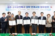 (아름다운교육신문) 완주군이 지역의 미래를 책임질 인재를 양성하고 교육 분야의 핵심 동반자 관계를 굳건히 하기 위해 관내 대학들과 손을 잡았다. 26일 완주군은 기전대학교, 백제예술대학교, 우석대학교, 한일장신대학교 4개 대학과 교육발전특구 대학 연계 사업을 위한 업무협약을 체결했다. 이번 협약은 지역 발전을 위한 완주군만의 지속 가능한 상생 모델을 구축하기 위해 추진했다. 완주군은 군민을 위한 대학별 특화 교육과정 운영을 전폭적으로 지원하고, 각 대학은 보유한 인적·물적 자원을 투입해 지역 성장과 주민 행복 증진을 위한 사업들을 발굴해 시행할 계획이다. 군은 지난 2025년부터 교육발전특구 시범 사업으로 기전대의 ‘동물 교감 치유 및 오감 체험 치유’, 우석대의 장애 청소년 진로 체험 ‘드림온(Dream-on) 캠퍼스’, 한일장신대의 ‘미술 치유를 통한 편백 숲 힐링’ 등을 추진해 왔다. 올해는 백제예술대학교가 새롭게 참여하면서 교육 콘텐츠가 더욱 다양해지고 사업의 내실도 한층 강화될 전망이다. 유희태 완주군수는 “완주군과 대학 간 협력으로 상생 시너지를 발휘해 지역 인재들이 우수한