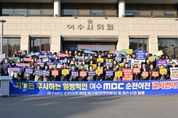 (아름다운교육신문) 여수MBC 순천이전을 저지하기 위한 여수시민들의 외침이 도심 한가운데 울려 퍼졌다. 15일 여수시에 따르면, 이날 오후 3시 여수시와 여수시의회, 시민사회단체로 구성된 ‘여수MBC 순천이전 반대 범시민대책위원회’는 시의회 청사 1층 공감뜨락에서 ‘여수MBC 지키기! 대시민 토론회 및 결의대회’를 가졌다. 이날 대회는 범대위 공동위원장인 여수시장과 시의장, 범대위 회원을 비롯해 시민과 시의원 등 3백여 명이 참석한 가운데, 1부 대시민토론회와 2부 결의대회 순으로 진행됐다. 이들은 결의문에서 “시민 의견을 배제하고 공론화 과정 없이 일방적으로 추진한 여수MBC 순천이전을 즉각 중단하라”며, “이전 계획을 철회하고 공영방송의 책무를 다하라”고 촉구했다. 정기명 시장도 “여수MBC는 지금이라도 시민들께 사죄하고 대화에 나서라”며, “대화를 통해 시민적 합의만 이뤄진다면 시는 어떠한 제안도 수용할 준비가 되어있는 만큼 이 위기를 함께 헤쳐 나가자”고 밝혔다. 한편, 참석자들은 행사를 통해 결의를 다지고, 여수시의회를 출발해 KB국민은행과 (구)송원백화점, 해양경찰서, 여수M