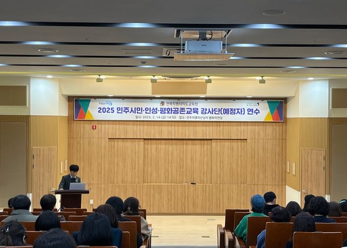 전북교육청은 이와 관련 이날 전주치명자산성지 평화의전당에서 강사단 참여 예정자 등을 대상으로 ‘2025 민주시민·인성·평화공존교육 강사단 연수’ 프로그램을 운영했다.