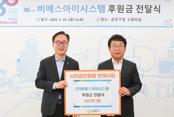 (아름다운교육신문) 금천구는 지난 14일 ㈜비에스아이시스템에서 지역 내 취약계층을 위한 후원금 500만 원을 전달했다고 밝혔다.