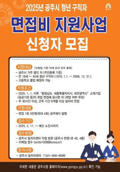 (아름다운교육신문) 공주시는 지역 청년들의 취업 준비에 따른 면접 비용 부담을 덜어주기 위해 ‘2025년 공주시 청년 구직자 면접비 지원사업’을 추진한다고 17일 밝혔다.