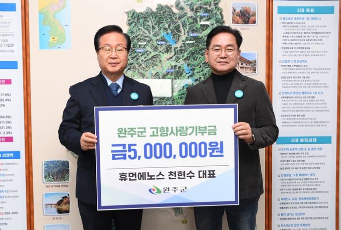 (아름다운교육신문) 농업회사법인 유한회사 휴먼에노스 천현수 대표가 완주군에 고향사랑기부금 500만 원을 기부했다.