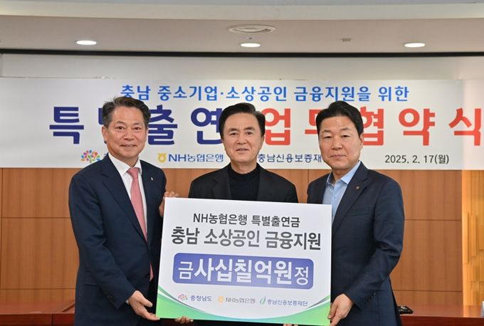 김태흠 지사는 17일 도청 상황실에서 박장순 NH농협은행 충남본부장, 조소행 충남신용보증재단 이사장과 ‘중소기업·소상공인 금융 지원을 위한 특별출연 업무협약’을 체결했다.
