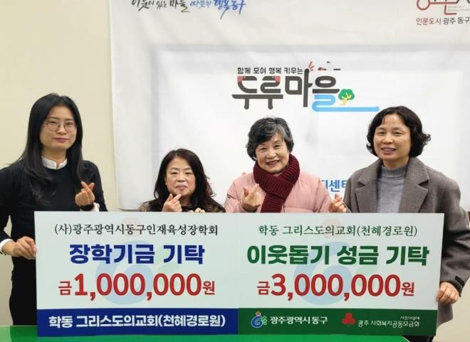 (아름다운교육신문) 광주 동구 학동은 천혜경로원(학동그리스도의교회)으로부터 어려운 이웃을 위한 후원금 3백만 원과 인재 육성 장학금 1백만 원 총 4백만 원을 기탁받았다고 밝혔다.