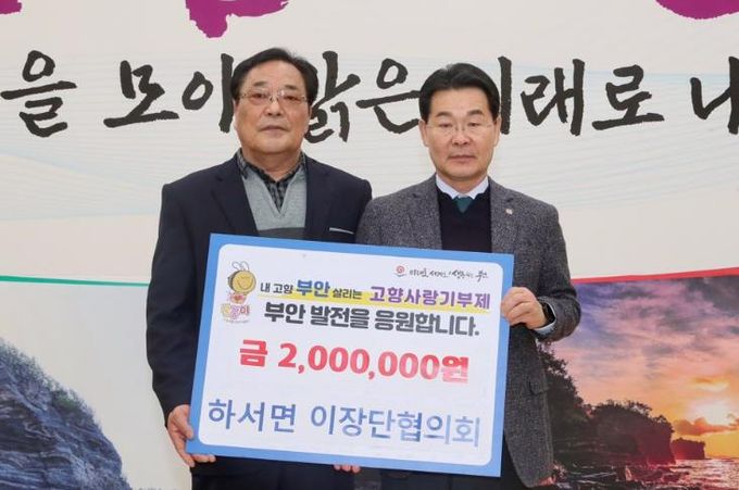 하서면 이장단협의회 황선관 회장은 “지역을 위해 늘 함께해 온 이장단이 마음을 모아 기부를 실천하게 되어 뜻깊다”라며 “앞으로도 부안군과 하서면의 발전을 위해 지속적으로 관심을 갖고 기여하겠다”고 전했다.