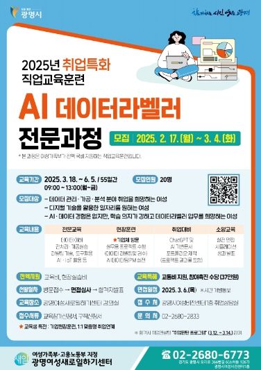 한편, 광명여성새로일하기센터는 AI 데이터라벨러 과정 외에도 ‘공동주택 ERP 사무원’, ‘현장맞춤형 사회복지사 양성과정’, ‘정리수납 매니저’ 등 다양한 직업교육훈련을 운영할 예정이다.
