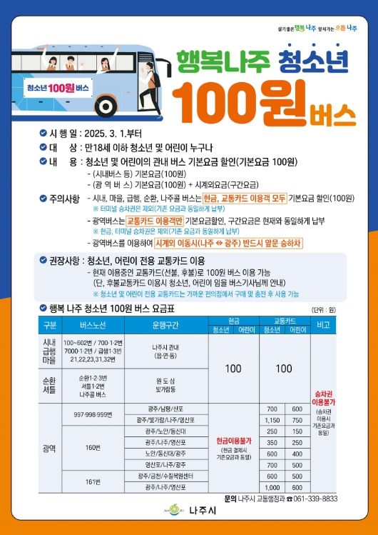 ‘행복 나주 청소년 100원 버스’ 정책에 대한 세부 사항은 나주시청 누리집 또는 읍·면·동 행정복지센터, 각급 학교에서 확인할 수 있다.