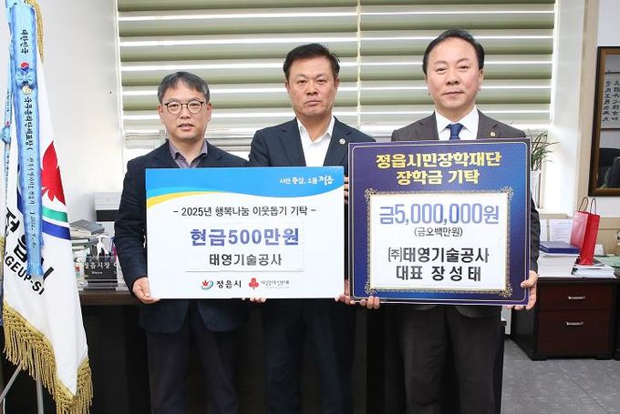 시는 지난 17일 ㈜태영기술공사 장성태 대표가 500만원, 현정어린이집 교사회가 100만 원을 정읍시민장학재단에 기탁했다고 밝혔다.